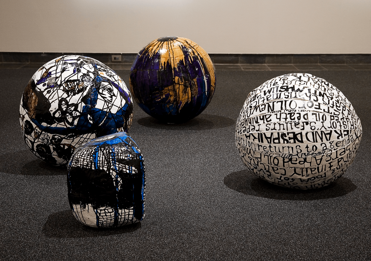 Jones work consisted of four handmade papier-mâche orbs – three collaged with world news headlines referring to the internet, climate change, and the ‘Predator’ drone fighter planes above Afghanistan. The fourth orb featured imagery of politicians, protestors and soldiers.
