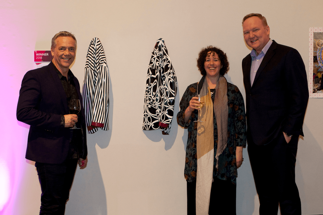 2018 National Contemporary Art Award winner Sarah Ziessen in front of her work You and Me. The Weight of History, with Brian Squair of Chow:Hill Architects and Jon Calder of Tompkins Wake Lawyers. Photo courtesy of Waikato Museum Te Whare Taonga o Waikato.