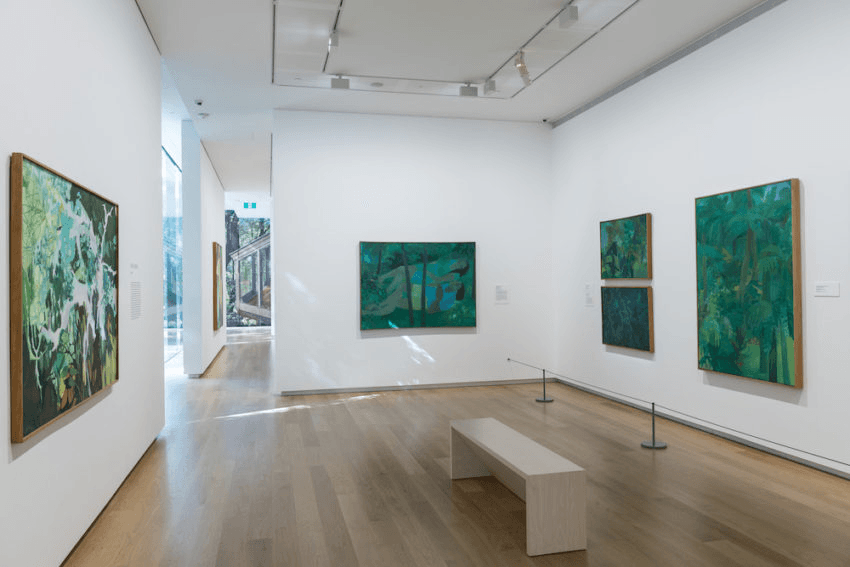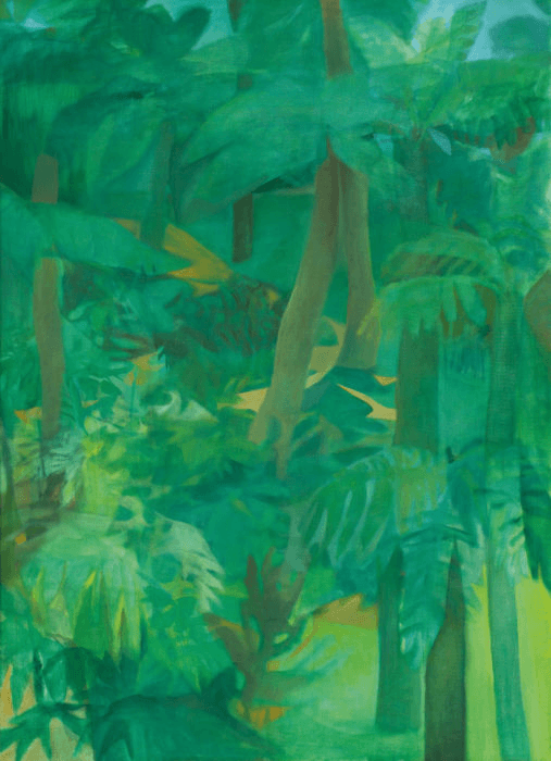 The biggest revelation is Henderson’s Bush Series 1970-72, painted on the artist’s return from a period of extensive travelling in Europe. The fresh green and blue palette and rich compositions of these large-scale paintings of the bush in Aotearoa radiate. Here is an artist immediately inspired by the vitality of her surroundings. Despite being created over 50 years ago, the series has a distinctly contemporary feel – Henderson applies her “all over” compositional approach to the ephemeral effects of light and shade. There is a palpable immediacy in their execution.