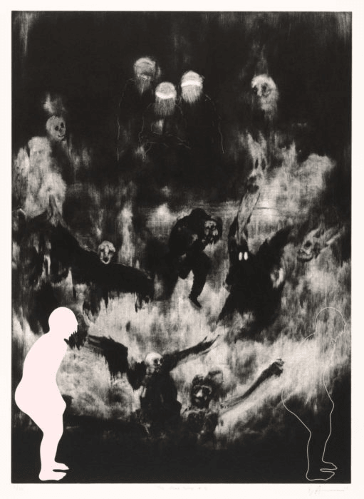 Yet in his use of stark and solemn blacks and whites Harris acknowledges a connection to New Zealand; that, bushfires aside, there’s a darkness in the New Zealand landscape that isn’t as present in Australia. In his work however, Harris also drops in surprising accents of colour. Blush pinks, buttery yellows and bluish lavenders form drips that turn into figures or bodies in an abstract, melting effect.