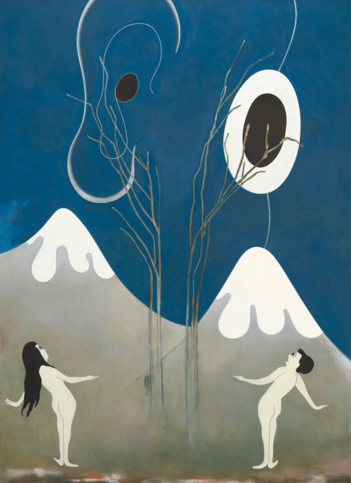 I think of his painting ‘Peaks (The Other Side)’ where two witnesses amid two snow capped mountains look skyward at a figure, perhaps a God of some sort, appearing in the sky.