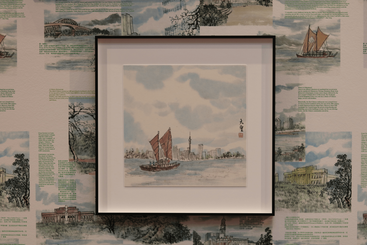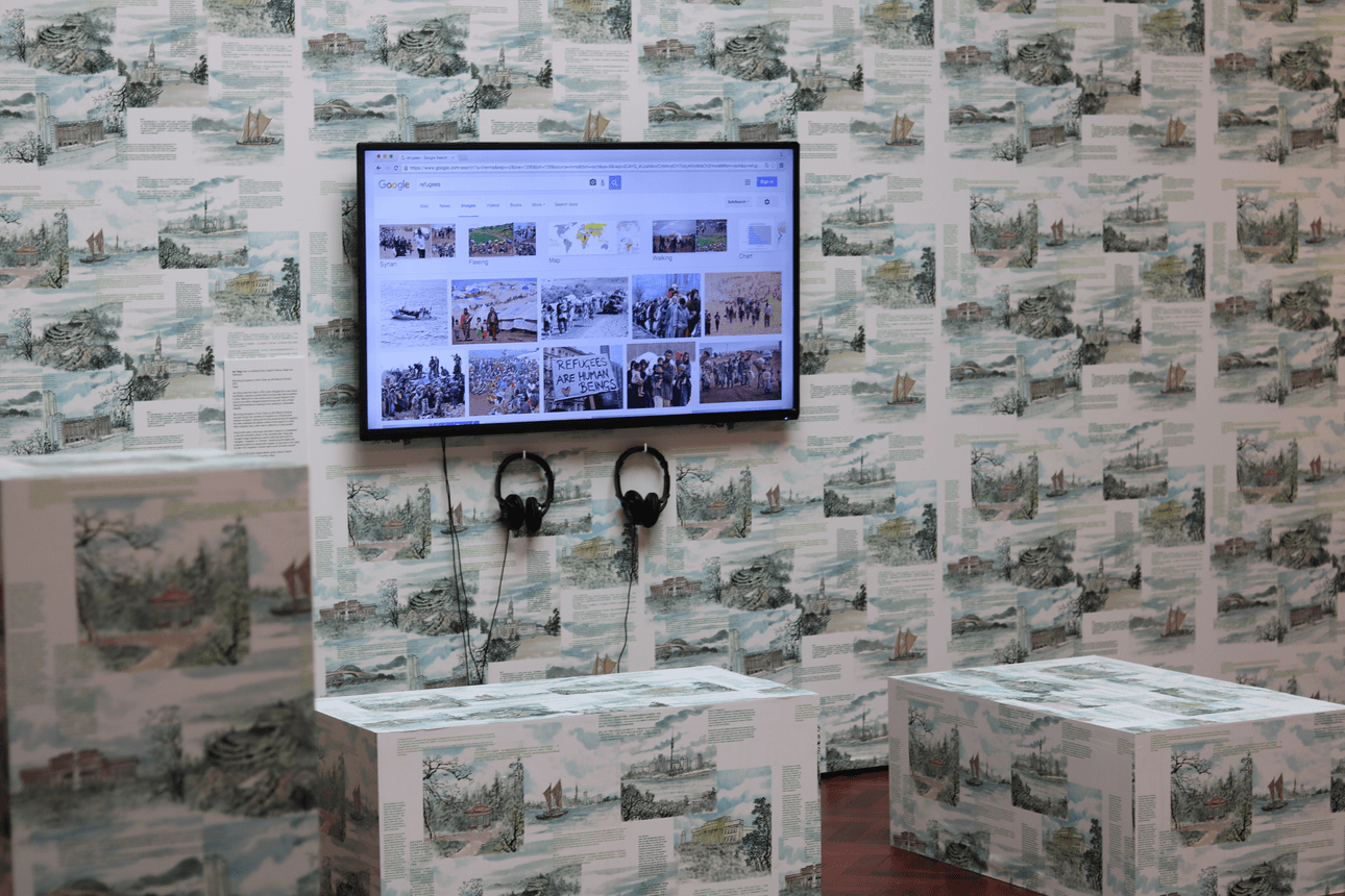 Walking off a grey Auckland city street, the bright painted colours that have become synonymous with Gus Fisher’s exhibition design are immediately apparent, this time in the striking work of Jun Yang’s Àokèlán (2019). A wallpaper of Chinese ink paintings by Da Shen spans two walls and responds to New Zealand’s Chinese history. Stories, histories and images are taken from the internet, reinterpreted and collaged together. Neither Yang or Shen have been to Auckland, thus the wallpaper is an “imagined reality” based on Google searches. Yang’s film Becoming European or How I Grew up with Wiener Schnitzel (2015) plays on a screen on top of the wallpaper. The film is a satirical account of Yang’s own migration story to Austria. As we listen to Yang’s narrative, on screen the artist sifts Google’s image repository searching for terms like “Chinese” and “refugee”. Yang’s personal, complex voiceover is juxtaposed with the disconcertingly stereotypical images, demonstrating how Google can be a site of mistranslation. If we only ever get to know each other through Google, then we’ll know very little.