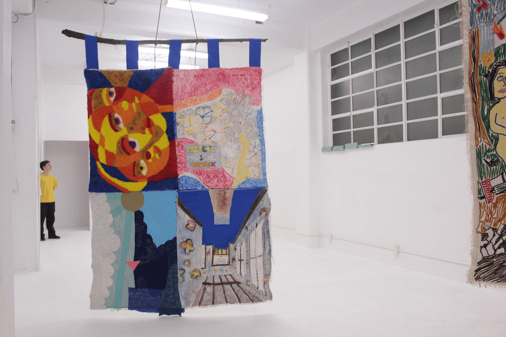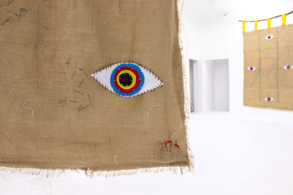 SISSYMANCY! draws energy from an organic postmodern collision of textile histories. These quilts on modest, monkish hessian sack backings are studded with multi-coloured target-like cartoon felt eyes. The quilts are like friendly seers, welcoming your animation – your reading – of the work. The cartoon-eyes also conjure the all-seeing eye of God, found across religions, looking out over humanity. Yet there’s a touch of Disney here too in the graphic of a talking sentient tree.