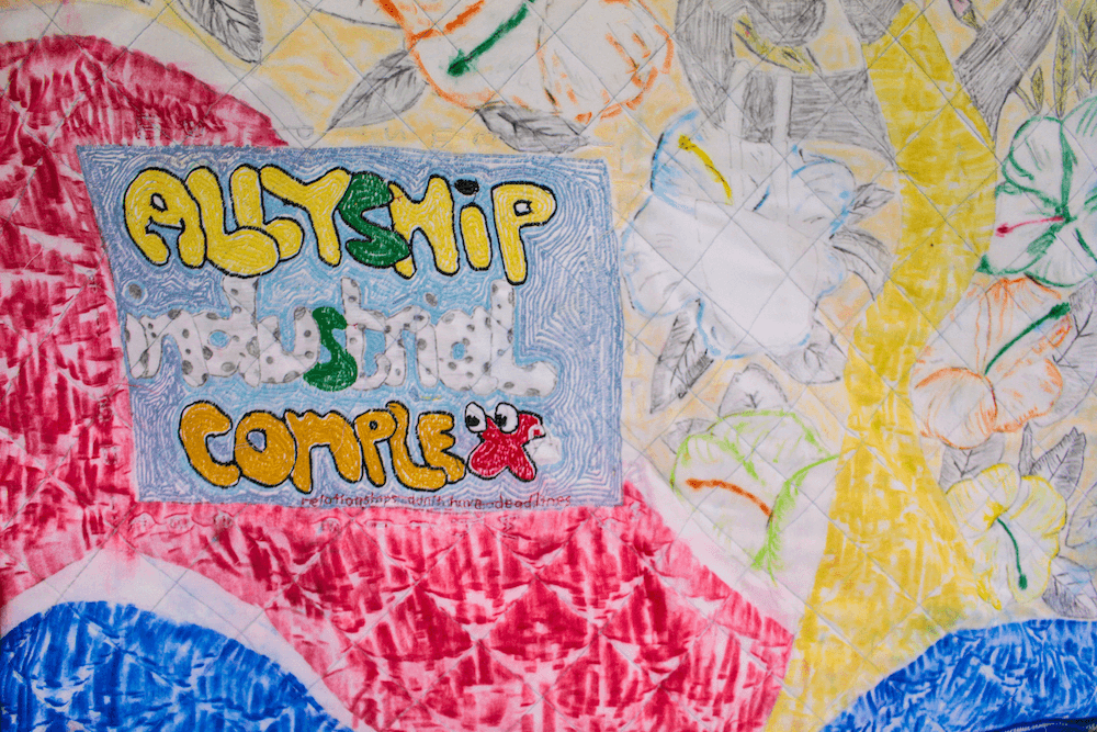 SISSYMANCY! speaks of and to the sanctity of seeding and growth, and the necessity of collaboration to achieve it. Sewn into the quilts are several mantra: ‘the burden of bounty;’ ‘penetration sans gender’, and ‘allyship industrial complex’. I look up allyship. It is “the process of building relationships based on trust, consistency, and accountability with marginalised individuals and/or groups of people.”