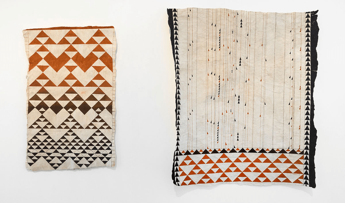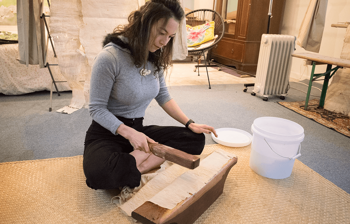 Ngāpuhi and Te Rarawa artist Nikau Hindin has recently been taught by ancestors in Hawai’i the skills of beating tapa or barkcloth, reviving as contemporary form a Māori art largely lost after the extinction of the aute plant in Aotearoa. Aute was introduced to Aotearoa by Māori from the Pacific.