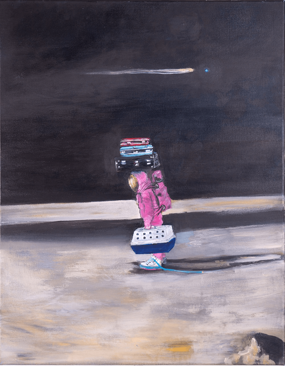 The image itself touches on everything from a scorched earth, to climate refugees, perhaps even to the avoidance of infection. (Sharon Singer has other creepily premonitory paintings of people socialising with face masks in outdoor settings.) It also suggests space exploration; a sense of adventure; threat and fragility; the ludicrousness and the tenacity of so much human aspiration. Yet it also seems like someone else’s dream of my past.