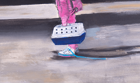 The child in the painting could be my dark-haired little sister, her sweetly rounded limbs when she was under five. She could be in a child’s androgynous, asexual version of the strange gift overalls from the 1980s: a little like a child dressing up as a superhero. The image brings back memories of our guinea pigs: we sometimes carried them in the kind of pet transport cage seen in the painting, and of course, they tried to escape us. It brings back the time well before them, when I tried to run away, with a small, brown, ginger-nut textured zip-up school-case. (I sat happily on a street corner, telling the adults in a car that stopped to ask if I was all right, that I had left home forever. I had a book, a warm jersey, a toy rabbit and maybe an apple so I was going to be fine.)