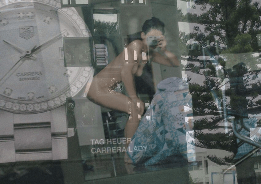 ‘Carrera Lady, Quasi Femme, The Watches’ is two different images overlaid. The first image is a screenshot of some footage I took of a luxury watch billboard at the Auckland Airport on my camcorder, the brand is TAG Heuer. I really enjoy watch advertisements, they are always really slick and high production. I was also really obsessed with this National Bank ad at the time, which has an image of a ticking clock throughout. It’s high drama and I love it. The second image laid overtop is a naked self-portrait, but my face is obscured by the camera. I liked this idea of literally putting my body up as object of desire, but cropping my face out.