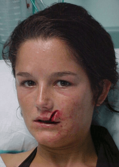 Me again. The facial gash was actually a result of a surfing accident. The surfboard fin came down on my face and sliced my lip open. I was 13 at the time. I remember my Dad driving me to the hospital and crying, not because of the pain but because I thought the gash would make me disfigured and ugly.