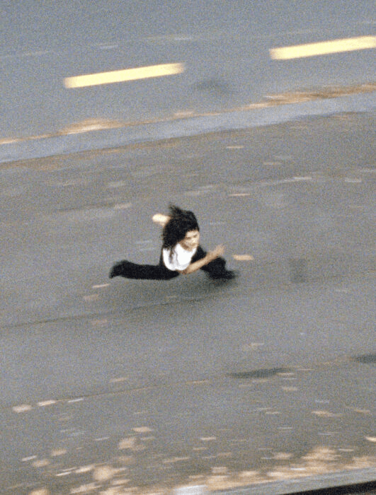 With this image I was thinking about more conventional modes of documentary ‘street’ photography, where a power dynamic is at play. The photographer in a position of power photographing its subjects. I wanted to confuse this logic by subjecting myself to the gaze of the camera. I made the image by running around the block as my brother photographed me from my bedroom window. The running from the camera applies this melodramatic narrative of escaping the camera’s gaze. It is a self-portrait, but one where I am both the subject and the spectator.