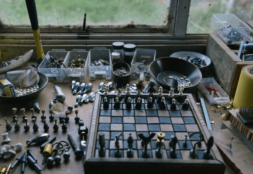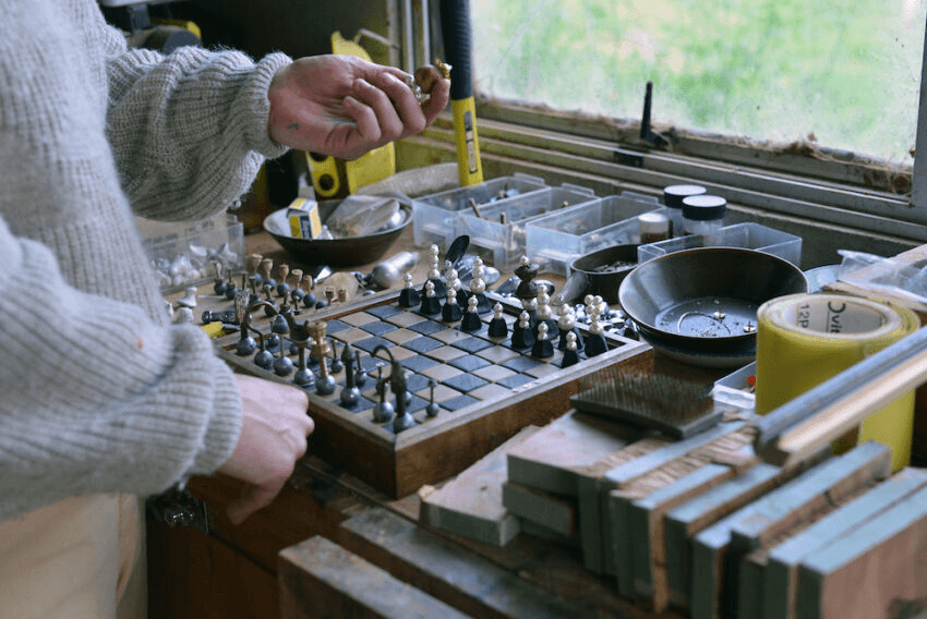 That’s my garage, that’s where I do my dirty works. Where I can make lots of dust and whatnot. The chess set was something I was doing over lockdown. Objectspace in Auckland [a public gallery] contacted me as part of their Maker series, where they wanted to give people the opportunity to learn how to do things with stuff they had lying around.