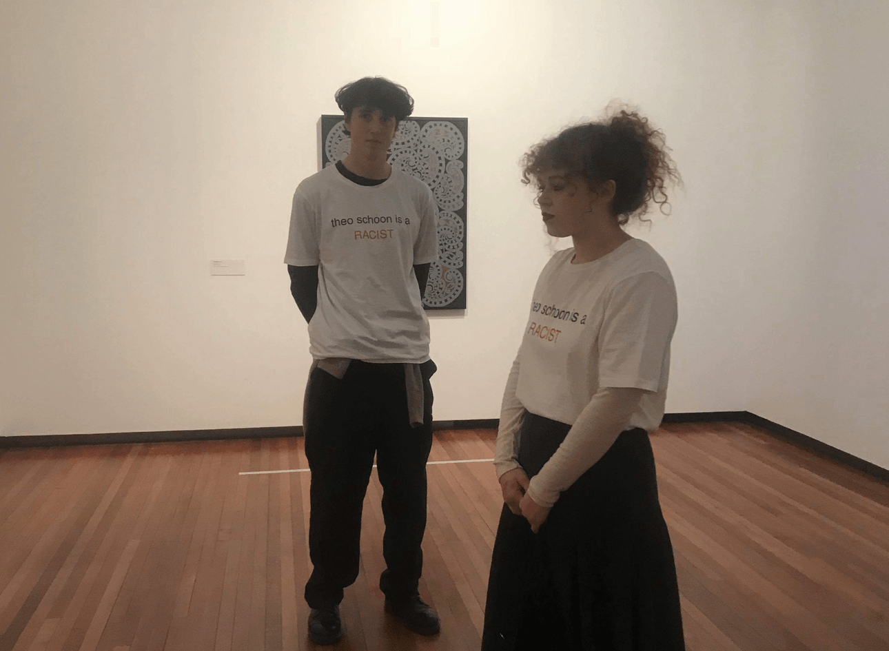 The question whether such works should be given time and space was thrust into the spotlight last Thursday by a group of protestors. The activists, made up of students and artists, spread themselves throughout the exhibition. They all removed the top layer of their clothing to reveal matching white t-shirts which on their front read ‘Theo Schoon is a racist’ and, on the back, ‘Fletchers supports this exhibition’ and ‘We stand with Ihumātao’’. Thus clothed, they engaged in conversation with gallery goers about their protest, and about Theo Schoon, the artist and the racist.