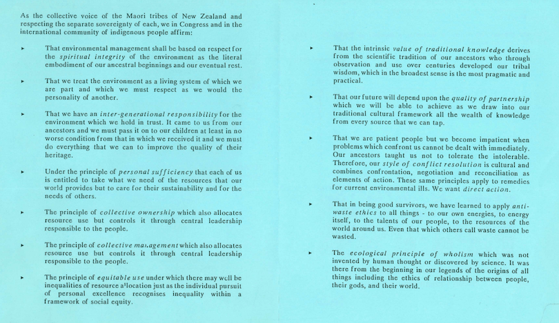 One notable exception was the National Māori Congress. This group of iwi representatives successfully negotiated a position on the official New Zealand delegation to the Rio summit. They used the platform to raise a wide range of environmental concerns at home, including climate change, biodiversity loss, pollution of waterways, the plundering of indigenous resources, and the pursuit of development over conservation. They were joined by indigenous peoples all over the world pressuring governments to consider the inextricable links between development growth, consumption, poverty and environmental degradation.