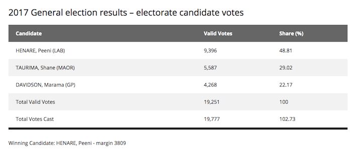 There are currently 38,756 people enrolled in the electorate. In the 2017 general election, 19,251 valid candidate votes were cast, only a 59% turn out – the lowest of all seven Māori electorates. Labour’s Peeni Henare won for a second term, with 49% of the vote. Henare has held it since 2014, after Pita Sharples retired from politics, having held the seat since 2005.