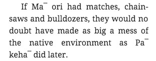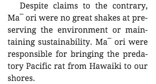 Bob goes on to point out that in fact, Māori claims to kaitiakitanga are disingenuous because of the introduction of the Pacific rat and the extinction of the moa. To think that those are comparable to mass pollution and habitat destruction as a result of colonialism and industrialisation would be hilarious if it wasn’t so disturbing. It goes without saying Māori have employed countless methods to protect species and natural resources as best they can, including rahui – hunting and gathering bans, placed on species during breeding seasons or when resources became scarce. Rongoā Māori medicine alone contains hundreds of rules about regenerating resources and giving back anything you take from the natural environment.