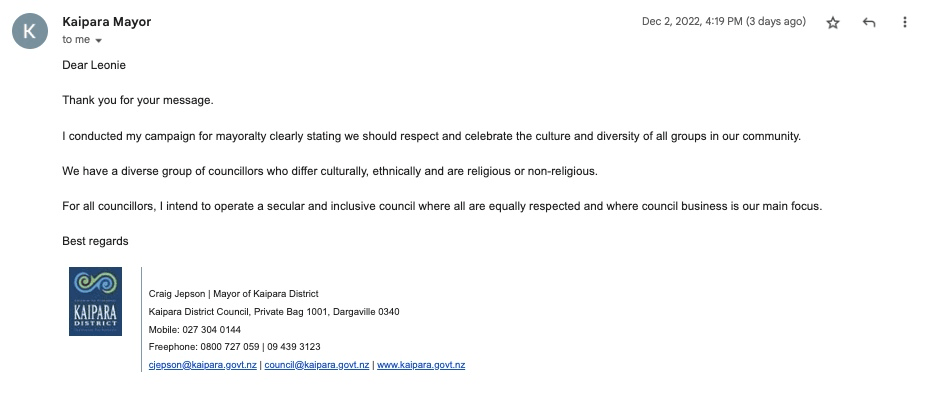 Last week newly-elected mayor of Kaipara, Craig Jepson, interrupted councillor Pera Paniora several times when she tried to open a meeting with karakia and ultimately banned the practice in order to remain “secular”. In an email sent to me (and paraphrased everywhere else) he stated: “We should respect and celebrate the culture and diversity of all groups in our community”.