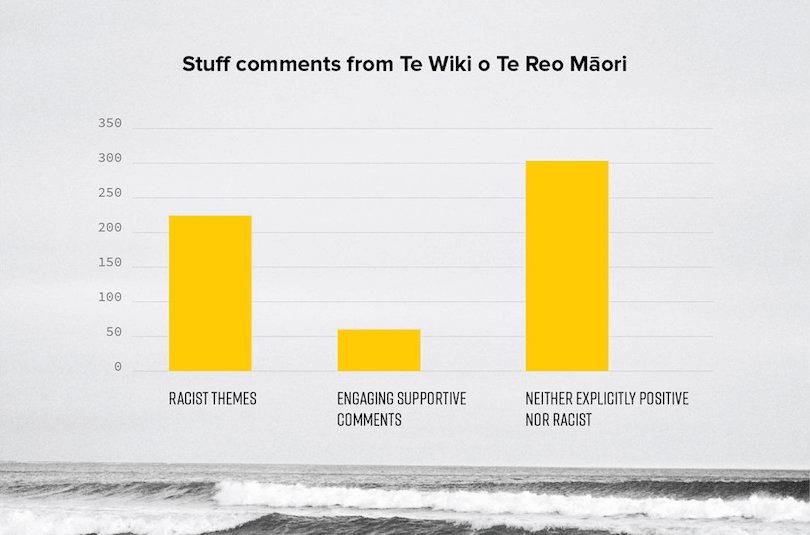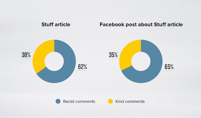 Our analysis found that, on average, readers of Stuff comments will encounter nearly four times as many different racist ways of thinking for each kind comment. Facebook users will encounter nearly five times as many.