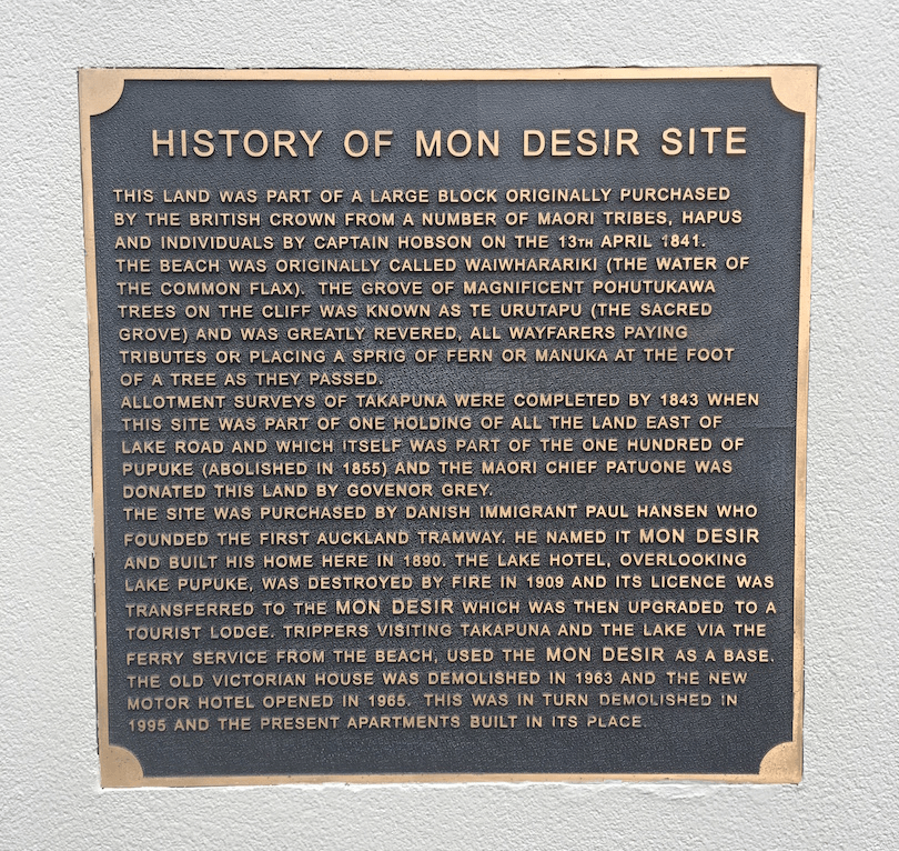 Walk up The Promenade. Past the Mon Desir apartments on your left is a plaque on the wall which tells you Takapuna beach “was originally called Waiwharariki (the water of the common flax). The grove of magnificent pōhutukawa trees on the cliff was known as Te Urutapu (the sacred grove) and was greatly revered, all wayfarers paying tributes or placing a sprig of fern or manuka at the foot of a tree as they passed.”