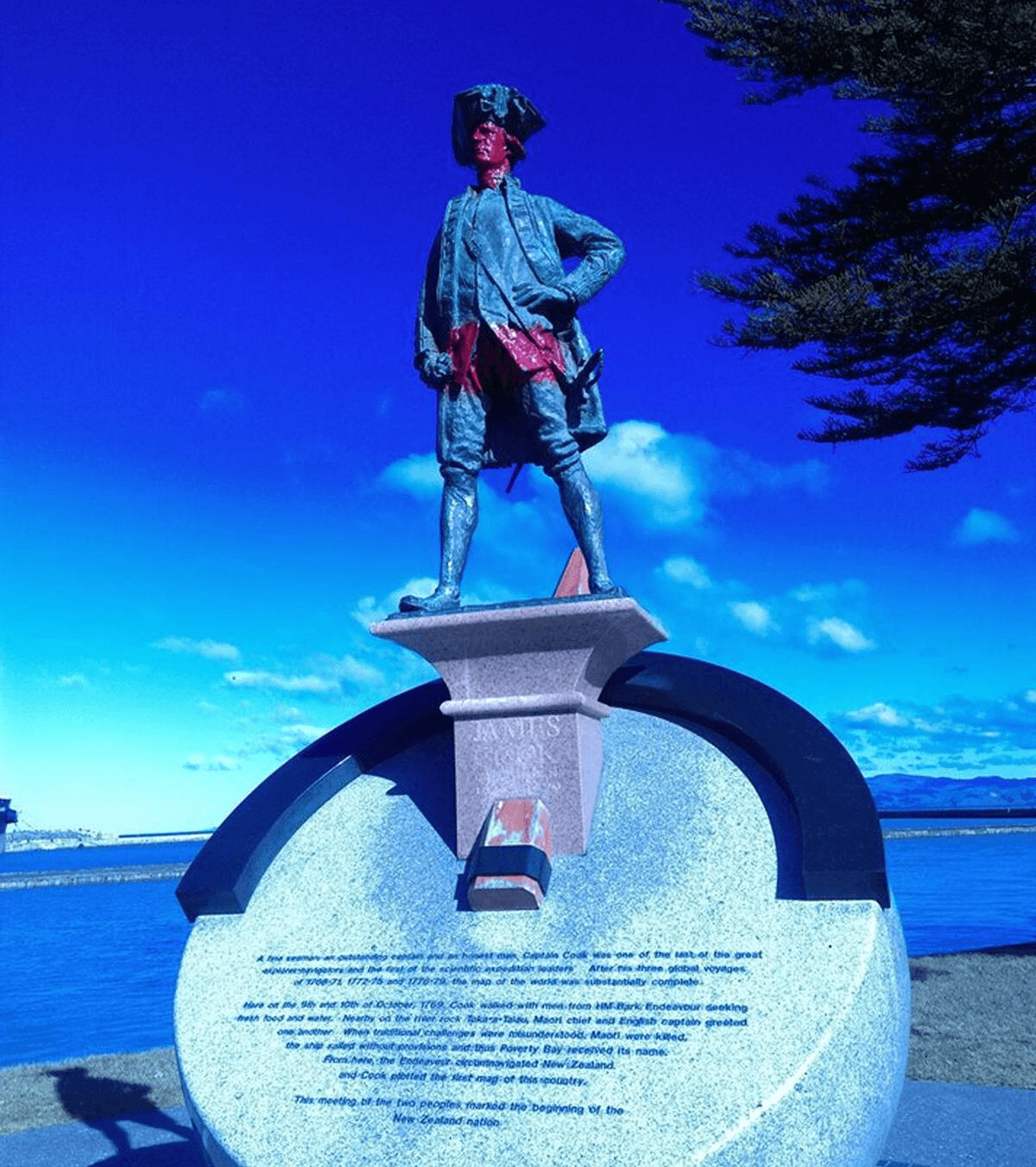 In Civic Square in Hamilton, right outside the Council building, is a statue of Captain Hamilton. It’s hugely problematic. Here‘s an interesting story about a kaumatua who defaced it.