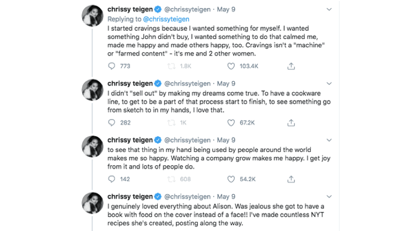 “Like, what Chrissy Teigen has done is so crazy to me. She had a successful cookbook. And then it was like: Boom, line at Target. Boom, now she has an Instagram page that has over a million followers where it’s just, like, people running a content farm for her. That horrifies me and it’s not something that I ever want to do. I don’t aspire to that. But like, who’s laughing now? Because she’s making a ton of fucking money.”