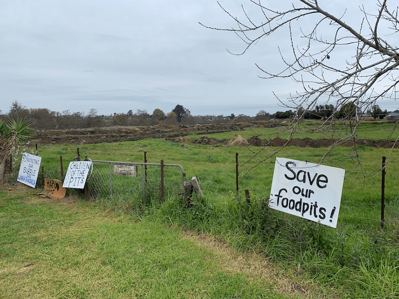 “Out of the 140 rua pits that we’ve identified with the pā site, only seven are remaining,” explains protest organiser Kimai Huirama. These remaining rua are located on the section recently sold to the Brian Perry Group, which plans to develop the site as part of the River Terraces residential development in the town.