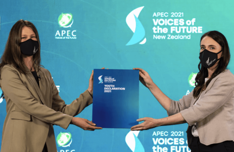 As one of four representatives from Aotearoa at the 2021 Apec Voices of the Future youth summit, Jess Jenkins (Ngāi Tūmapūhia-a-Rangi ki Wairarapa) had the inaugural honour of handing the youth declaration to the forum’s chair, prime minister Jacinda Ardern.
