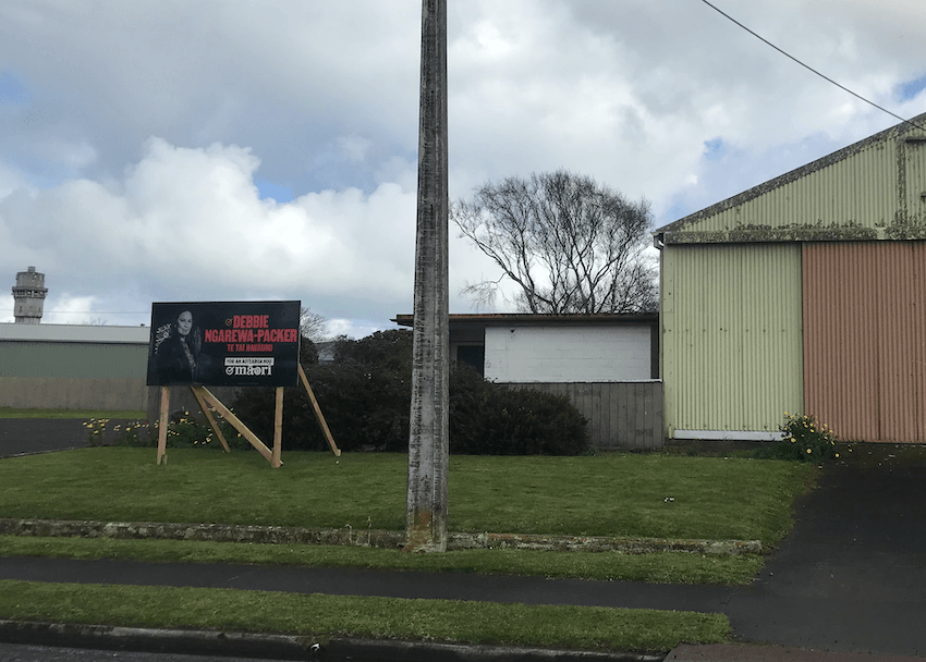 Hāwera, with a population of just over 10,000, is at the central coastal point of this expansive electorate, which stretches from Putāruru in southern Waikato to Porirua, north of Wellington. It encompasses nearly a quarter of the North Island, and holds the most diverse iwi makeup of any of the seven Māori electorates. Beyond a lone hoarding on the grassy neighbouring section imploring voters to vote Ngarewa-Packer for Te Tai Hauāuru, there are few visual cues that this is a candidate office. Partially that’s because – as the mud splattered on Ngarewa-Packer’s car suggests – an electorate this dispersed demands a mobile campaign.
