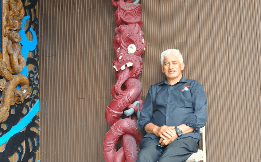 Outside the wharenui bearing his carvings, Matua Rei Mihaere drives his closed fist through the air.