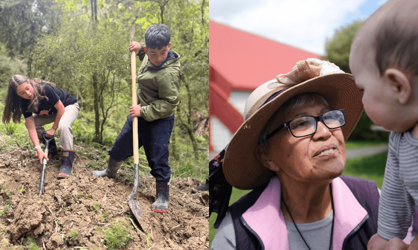 Yet, over and over again, people I spoke to reiterated that hope on its own isn’t the thing keeping them going. “Hope is abstract,” Shirley Simmonds of Ngāti Huri told me. She has recently made the move home to Pikitū with her whānau and is deeply attached to the shovel with which she’s she’s helped to plant the beginnings of a food forest, and also tree seedlings on land that was once – and will eventually again be – blanketed in native ngahere. “Hope needs to be activated through work,” Simmonds said. “Sovereignty is inherently practical. The solutions are within us – kei a tātou te rongoā.”