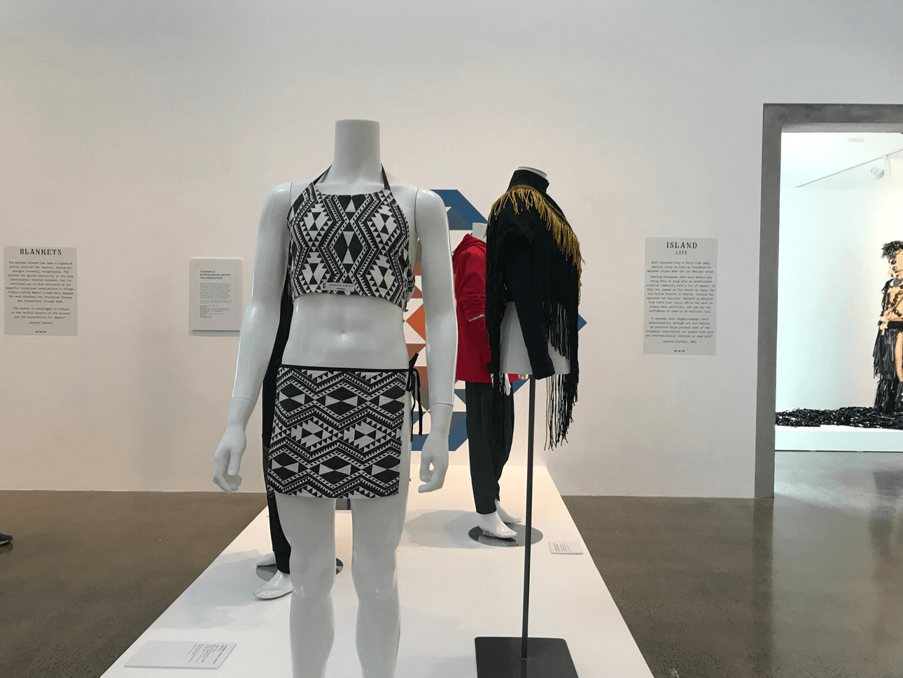 Tucked at the back of the exhibition are a trio of matching dance sets designed for contemporary Māori dancer Merenia Gray in 2001. They’re a whimsical expression of Clarkin’s ability to transform the traditional into the everyday. The near-identical shorts and camisole sets, in cornflower blue, orange and red tāniko print, are inspired by the knitted pari or bodices worn by kapa haka performers.