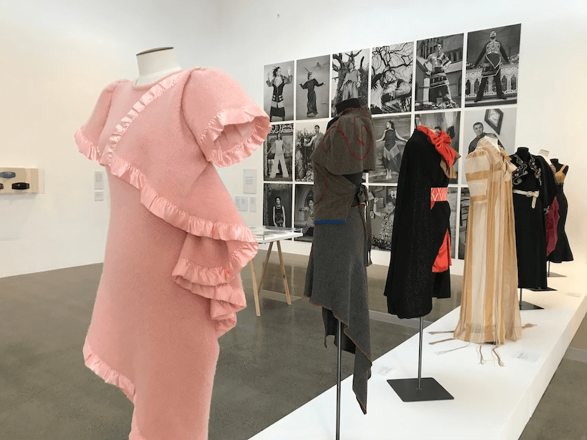 In the main room of the exhibition is one of the most striking garments in the retrospective: an asymmetrical bubblegum pink dress made from a repurposed wool blanket. Like many nostalgia-tinged objects of New Zealand’s past, the once-cheap blankets have become increasingly pricey. And while initially the vintage blankets were a cost-effective and sustainable way to access wool, for Clarkin, these pastel blankets are more than just fabric. With echoes of New Zealand’s long relationship with wool – the first wool mills in this country opened in the 1850s – they’re also an expression of social history, conjuring memories of colonisation, trade and, at times, life on the marae.