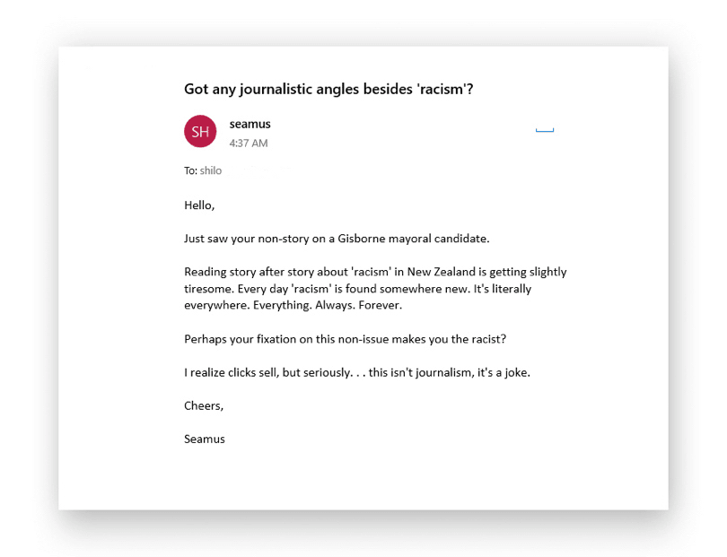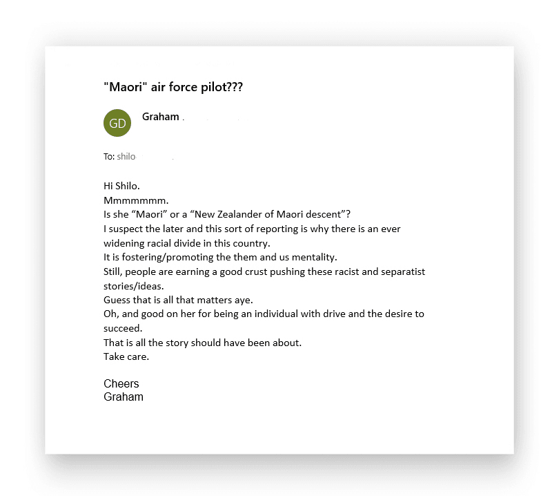 She emails me a response, claiming again she isn’t racist because she has two friends who are Māori. I really wish people understood that just because you have Māori friends, you don’t get a free pass. You can still be racist.