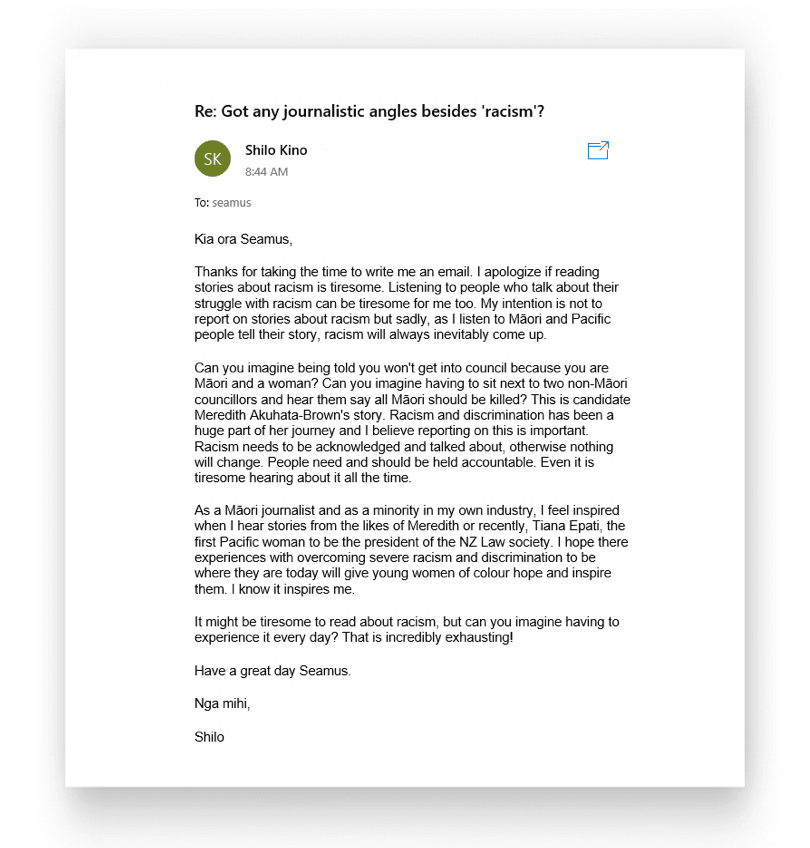 The world is more connected than ever and hundreds of racist attitudes are just a click away. From well-meaning to outright hateful, when you’re a young Māori journalist working in the mainstream media, the sheer volume can be overwhelming.