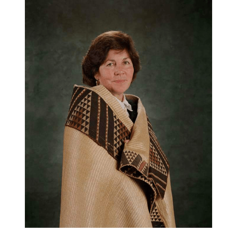 My mum Erenora wearing the kaitaka that belonged to her tipuna Ruhia Porutu. A kaitaka is a finely woven kākahu with no adornment, and has tāniko on one or more sides. It is the ultimate a weaver can produce as the weaving cannot be hidden by feathers – the work is laid bare: