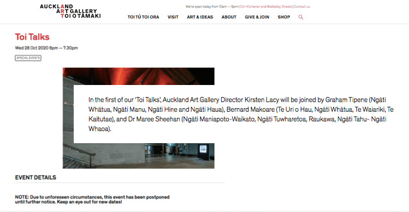 The Auckland Art Gallery website shows a cancelled October 28 event was a conversation with three Māori artists, to be hosted by Lacy.
