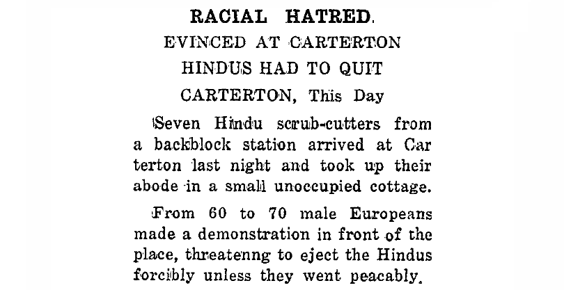Like the RSA’s anti-Indian resolution, the ethnic cleansing of Carterton was endorsed by many New Zealand newspapers. The Waipa Post, for example, printed news of the Indians’ expulsion alongside an editorial on ‘The Hindu Menace’.