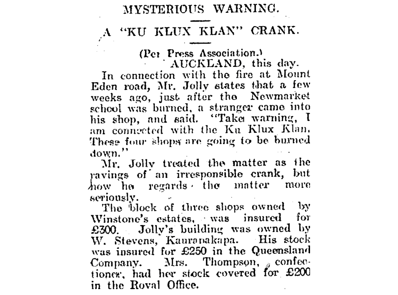Most of the early attacks against Indians were spontaneous, but soon the colony’s racists began to organise. In 1923 a retired Presbyterian minister from New Jersey named Huston toured New Zealand, promoting the Ku Klux Klan. At a meeting in Dunedin’s Knox Hall, Huston called the Klan a force for “light and truth”, and claimed that it had “saved the United States” by “putting the Negro in his place”. In August 1923 the Auckland Star announced that a branch of the Klan had been formed in the city, with the object of stopping ‘Oriental’ migration. In October an Indian-owned shop on Christchurch’s Colombo Street was vandalised, and a note saying “The KKK is here” was pushed under its door. In December four shops on Auckland’s Mount Eden Road burned down. One of the bereft shopkeepers told police he had recently been visited by a man claiming to represent the Ku Klux Klan. He had treated the man’s threats as a joke; now he knew the Klan was no joke.