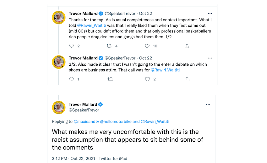Waititi says subsequent conversations with Mallard outside the house and over the phone confirmed the type of business the speaker was alluding to; that of basketball players but also drug dealers and gang members. The day after the interaction he tweeted: “What you didn’t see yesterday was on my way out of the chamber, the Speaker said to me ‘Jordans are usually worn by drug dealers and gangsters!’”