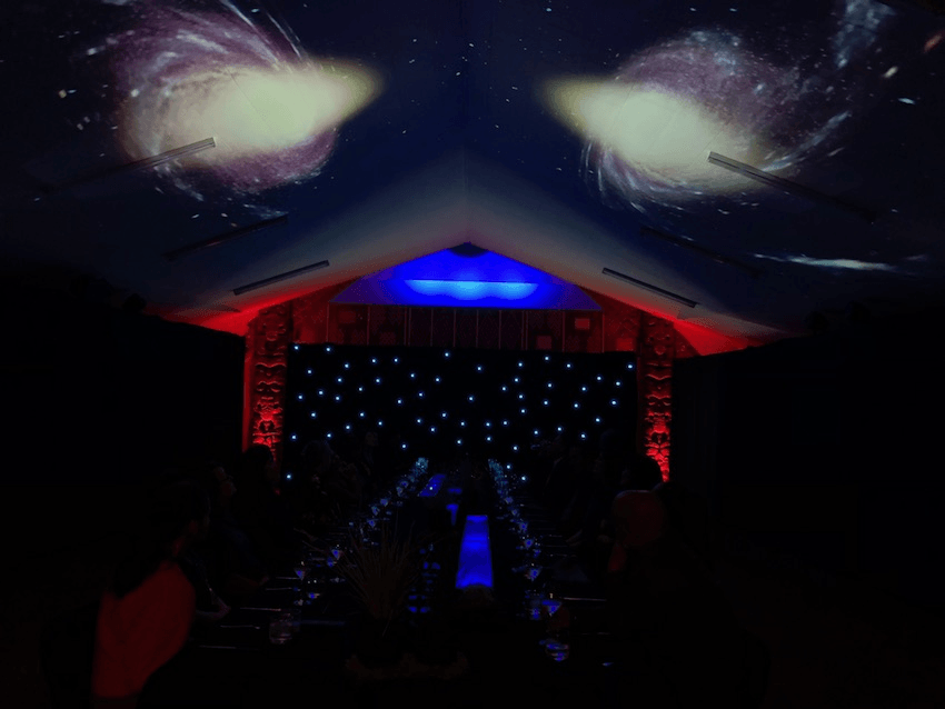 Inside the marae we entered a narrow, dark room, one end of which was covered in twinkly lights like the night sky. A long table — adorned with candles and blue light boxes representing the sisters’ awa — ran along the centre. Let me tell you, it was moody and atmospheric AF.