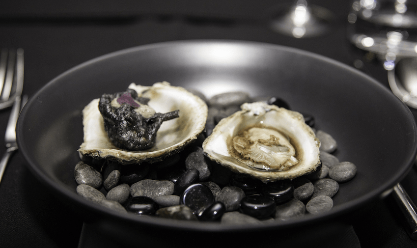 Te kore, the darkness, was the first part of the story, and after we’d heard Scotty’s evocative narrative, the wait-wāhine brought out dish number one. Echoing the darkness were two oysters on a bed of stone, one raw with black garlic, black vinegar and soy, the second coated in a charcoal tempura batter and paired with a creamed pāua sauce. Delicious.
