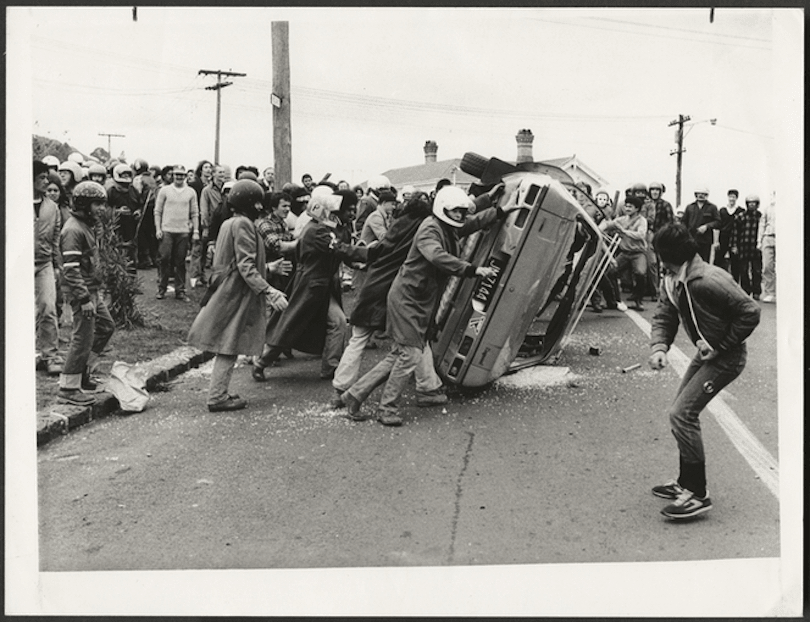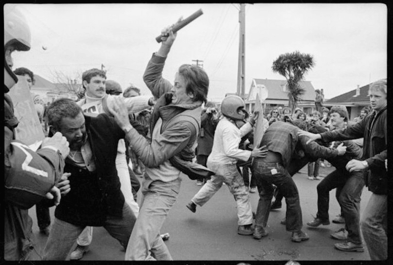 Singer and journalist Moana Maniapoto, then a first-year law student at the University of Auckland, remembers when the fence came down at the second game in Hamilton on July 25. “Everyone’s leaning on it, pushing and pushing it, and then the next minute the fence came down and you just heard this ‘Run!’ You’re just swept along. So then I’m in the middle thinking, ‘what am I doing here? They’re gonna kill us!'”
