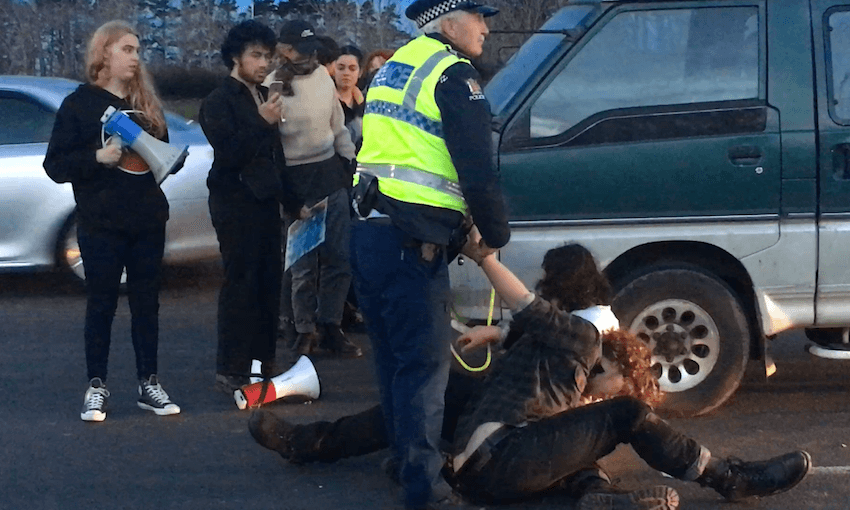 A group of 13 supporters, members of the socialist movement Organise Aotearoa, filed out of the vehicles and sat across the lanes chanting and blocking traffic. One person tied themselves to the van while the remaining formed a chain across the busy motorway. At least four people were arrested.