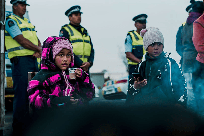 The line of parked vehicles stretched back up the road for several kilometres. Only vans carrying supplies, Māori Wardens and the elderly were allowed through. It had all the air of a festival, with musicians such as JessB performing to the large crowds from mid-morning.
