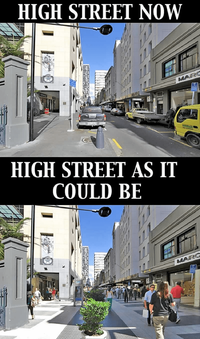 Move on to High Street, where efforts to pedestrianise have been held up by well-meaning but inexplicably dumb lobbying from local businesses. The street is meant to be Auckland’s premier shopping destination, but navigating it can feel like a mix of above-ground spelunking and cage fighting. The footpaths are barely 1m wide in places. Cars and parking take up 80% of the streetscape, despite being outnumbered by pedestrians by a factor of roughly 13 to 1. Even a small influx of shoppers can quickly cram all the available space. It would be vastly improved as a pedestrian zone, as envisioned in this picture by the now-defunct Eye on Auckland blog.
