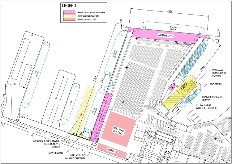 There will be a little bit of wharf extension east, to a dolphin that’s sited just off the northeast corner. The net effect of all alternations to the wharves is that 1.275 hectares will be removed and 1.250ha will be added. Pretty neutral.