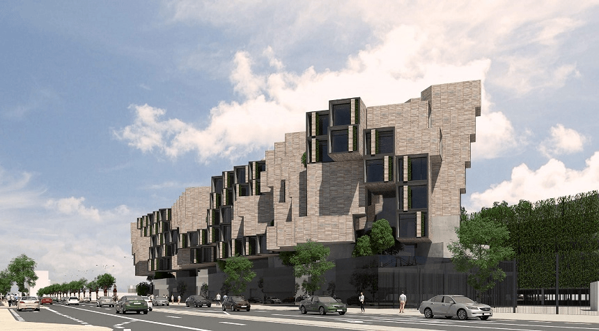 It was the architects, Australian firm Plus Architecture, who suggested that the best solution to the problem of the cars wasn’t a carpark building on its own, but to put a public building in front of the carpark. So they’ve come up with an impressive design for a hotel.