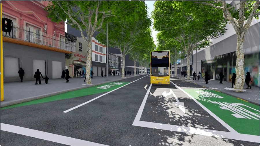 What’s proposed is even noticeably different from the concept design which I think was used to help get the CCAB to approve the use of the targeted rate funding. This is the same section and while some artistic licence has been taken with the scale of the trees, it clearly shows them in place of the bus bays: