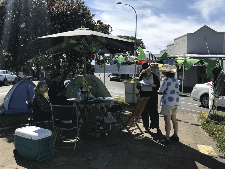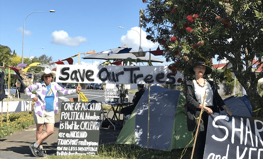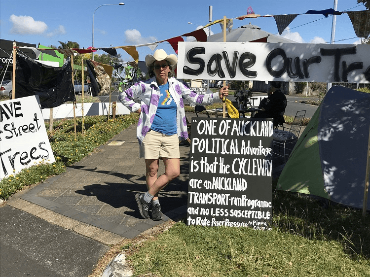 The protest is led by veteran activist Lisa Prager, who is never seen without a cowboy hat. The “Garnet Rd Traffic Island Occupation” is opposed to the removal of trees, the routing of the cycleways, the realignment of the roadway and the reduction in the number of carparks outside shops. Prager’s personal interest is twofold: she lives in the area and her partner Verity George runs Garnet Station, a cafe on Garnet Road.