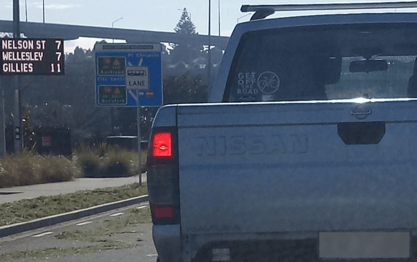 I first saw that awful sticker while stuck at a traffic light. It contained an iconised bike enclosed within a circular no symbol. Next to it, in all caps: GET OFF THE ROAD. Straight to the point. I was driving at the time, it’s difficult to get from West Auckland to the North Shore on a weekend via any other means (that’s a whole other can of worms though). However, I was relieved I was not on my bike, forced to share the road with this civic-minded, 4WD lobbyist. I couldn’t help but wonder: what sort of person harbours so much resentment towards cyclists that they would adorn their vehicle with such a sentiment. Did they pick up the sticker by chance? Where do you even find such a thing? I pictured the driver ordering the sticker online, smouldering with resentment. That will show those pesky cyclists!