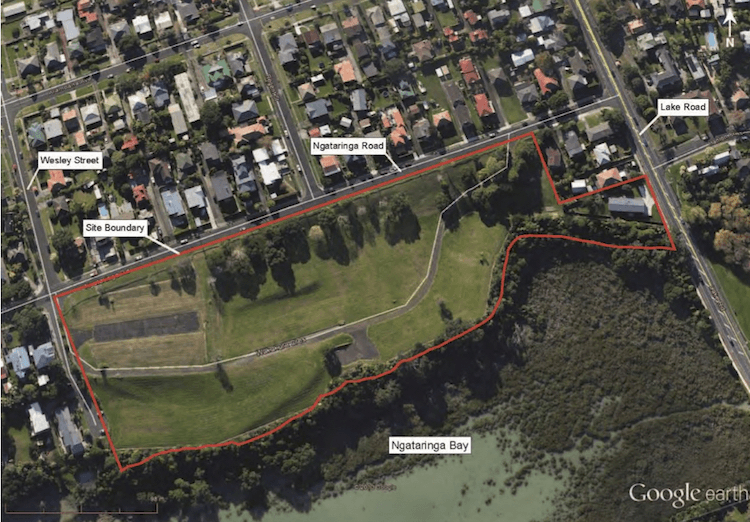 The retirement village is proposed for land on Ngataringa Rd in Narrow Neck formerly owned by the Navy. Ngāti Whātua now owns the 4.2ha site and has leased it to Ryman for 150 years. It’s sloping parkland, just off Lake Rd and leading down to Ngataringa Bay, as the aerial photo below shows.